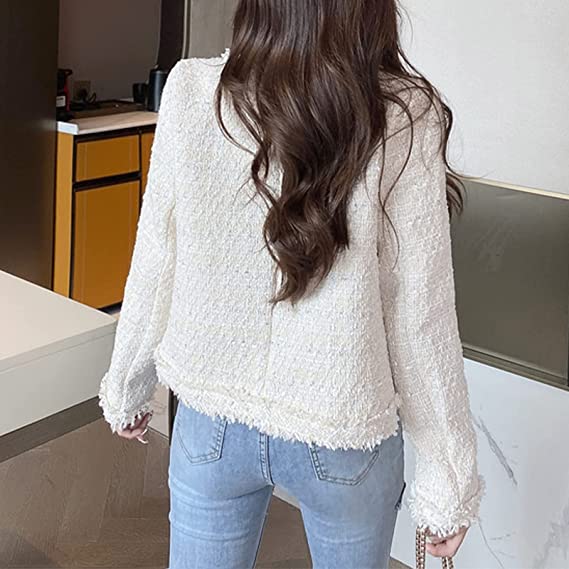 Material: womens tweed blazer made of polyester and spandex. Soft and comfortable, great for in-between weather, best for spring, autumn and winter.